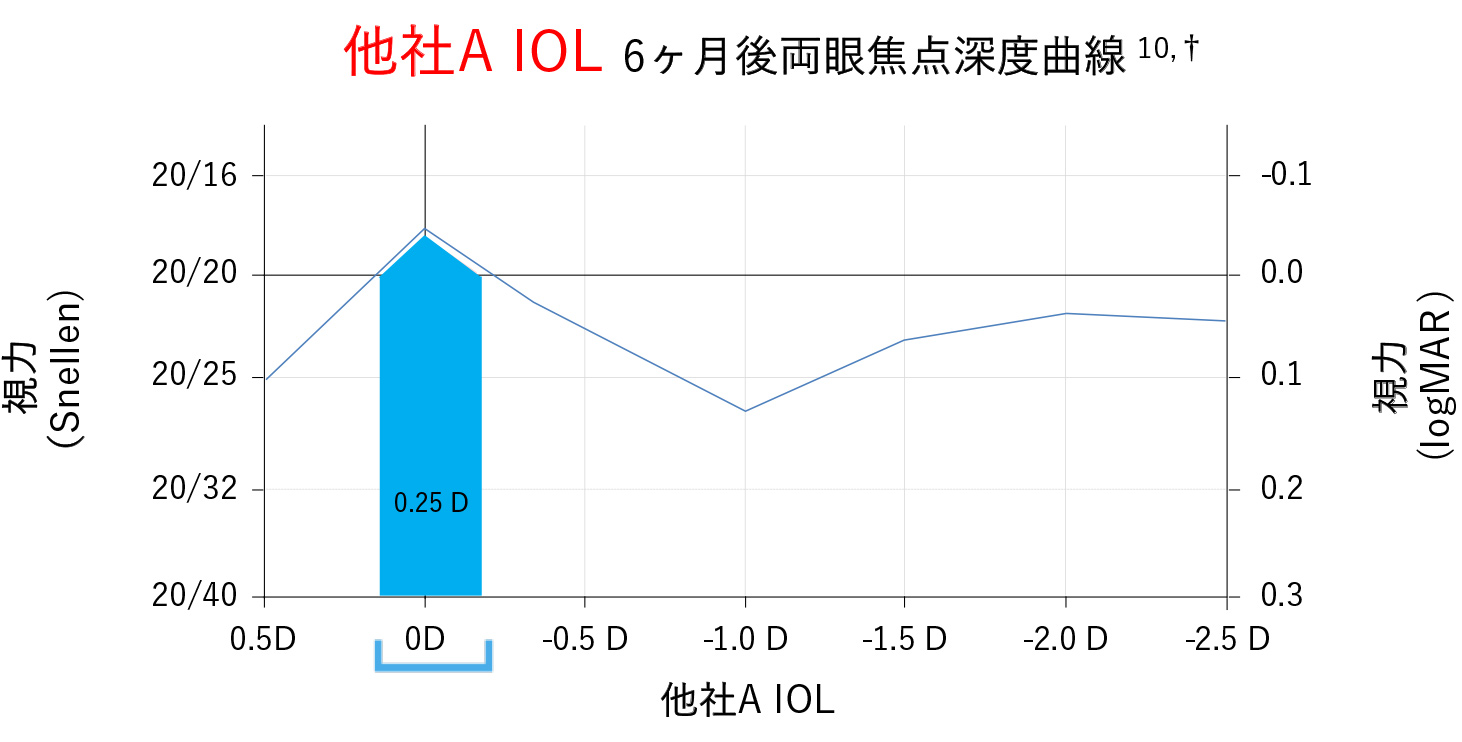 他社A IOL は1.0以上の遠方視を得られる範囲が狭く、遠方視に対する屈折ズレへの許容性が低いです